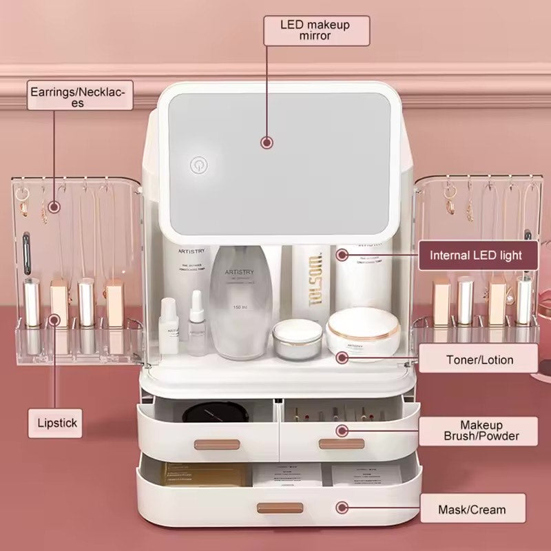 Optez pour la praticité sans compromis sur le style avec notre Boîte de Rangement à Écran LED. Gardez vos produits de beauté et accessoires organisés et à portée de main en tout temps. Commandez dès maintenant et transformez votre espace de beauté en un sanctuaire de style et de fonctionnalité !